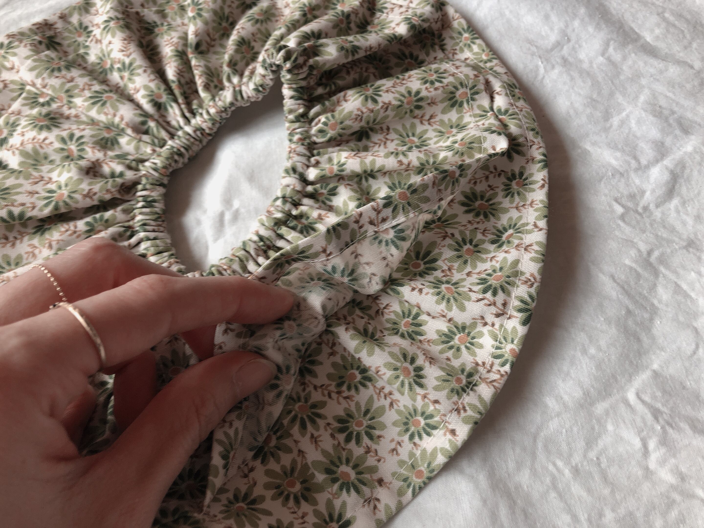 2段の生地に、愛らしいギャザーをたっぷりとあしらい、ほどよく立体感が出るように仕上げています。