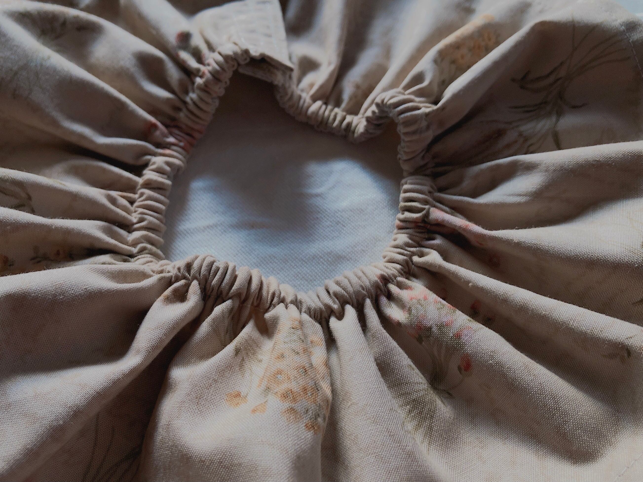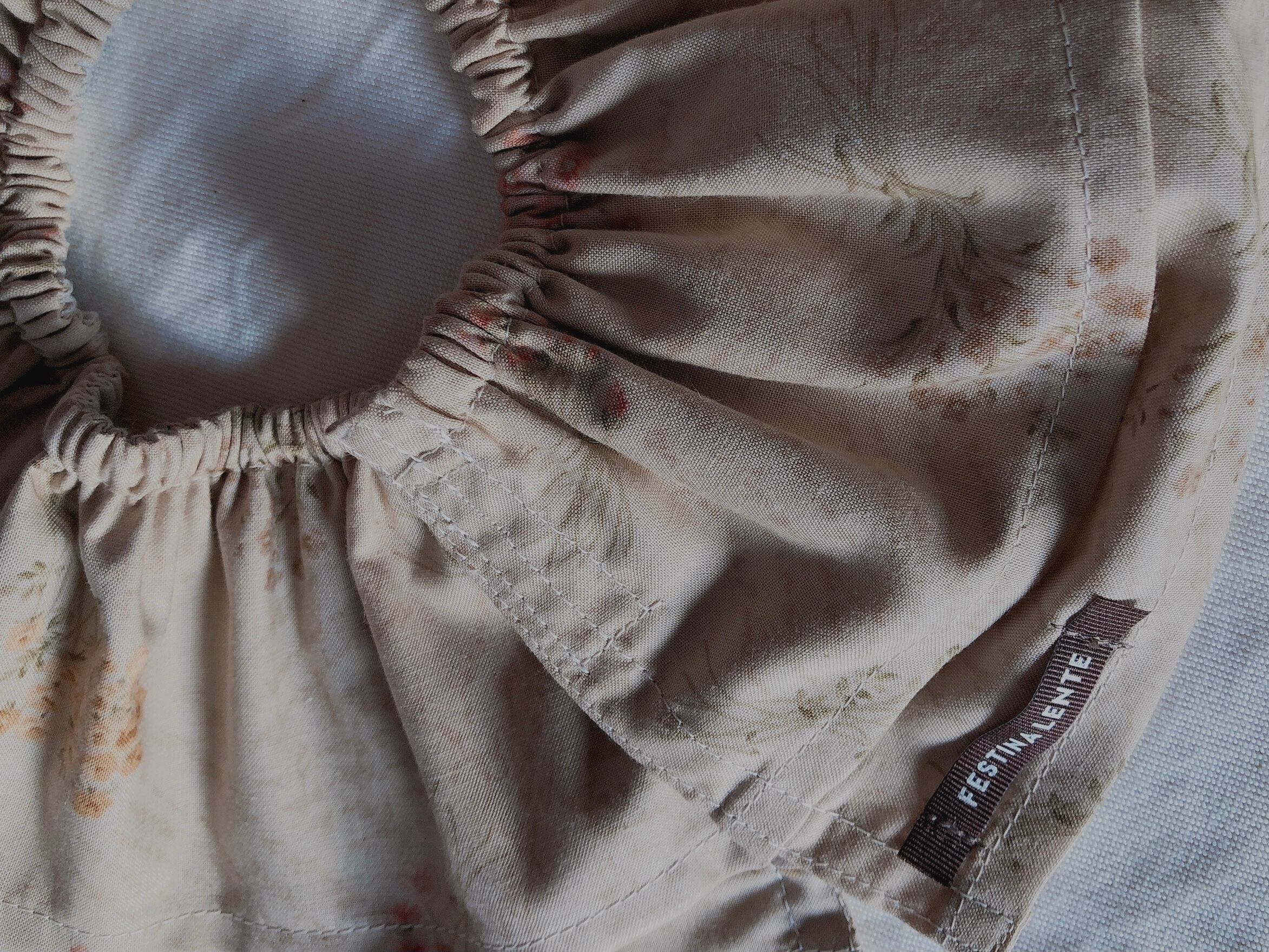 2段の生地に、愛らしいギャザーをたっぷりとあしらい、ほどよく立体感が出るように仕上げています。