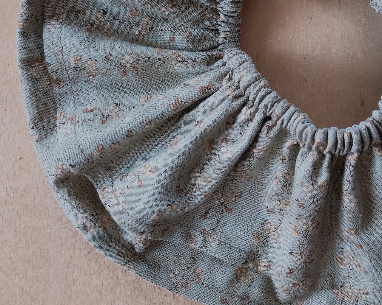 2段の生地に、愛らしいギャザーをたっぷりとあしらい、ほどよく立体感が出るように仕上げています。