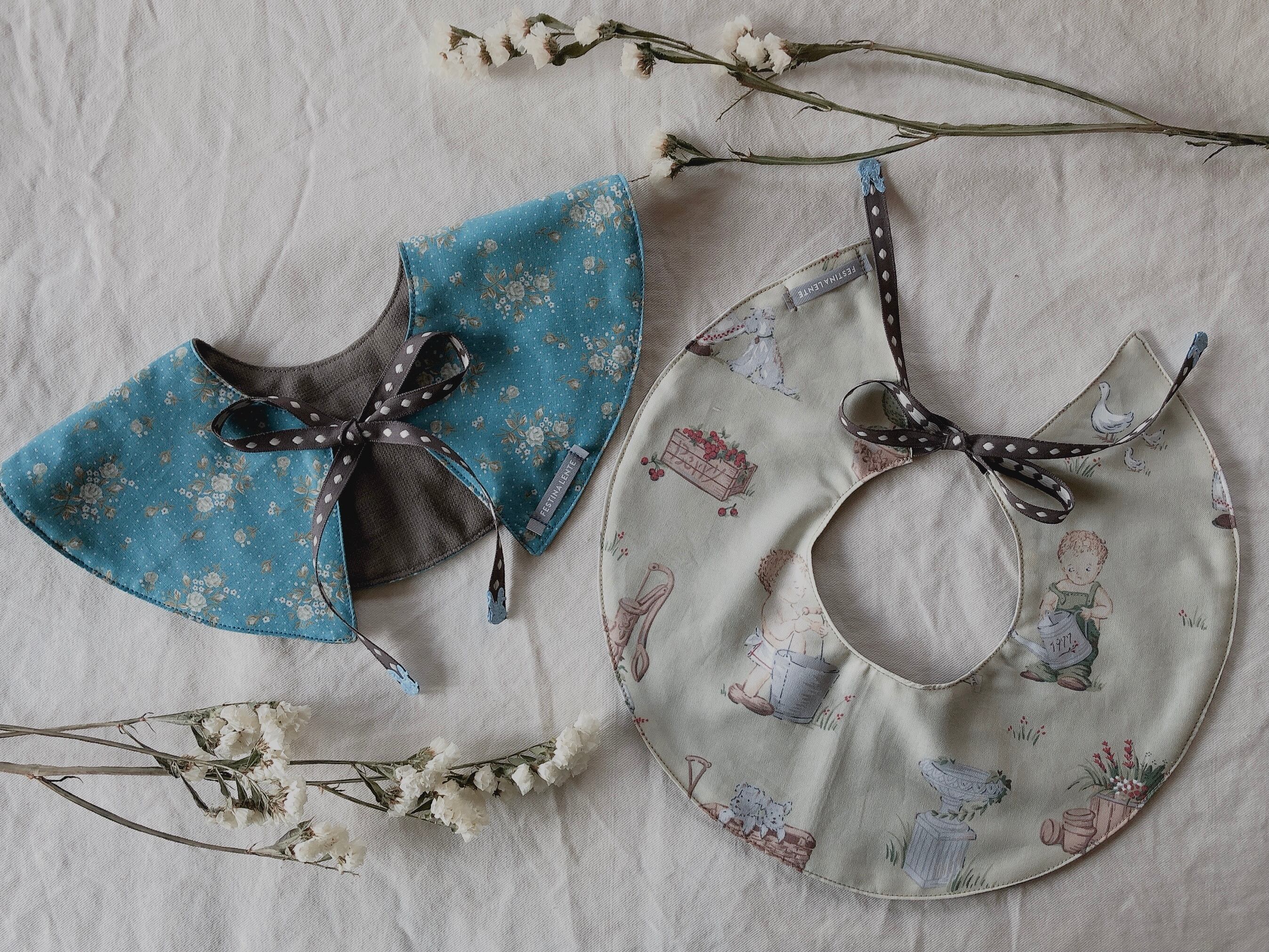 生地コレクターである母の生地コレクションの中から、こちらのビブにぴったりの生地をセレクトしております。