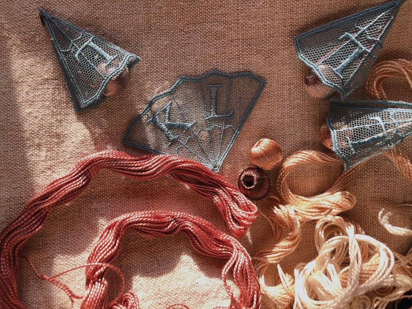 たくさんあるレースのストックの中から、て耳飾りにしたいものを使っています。