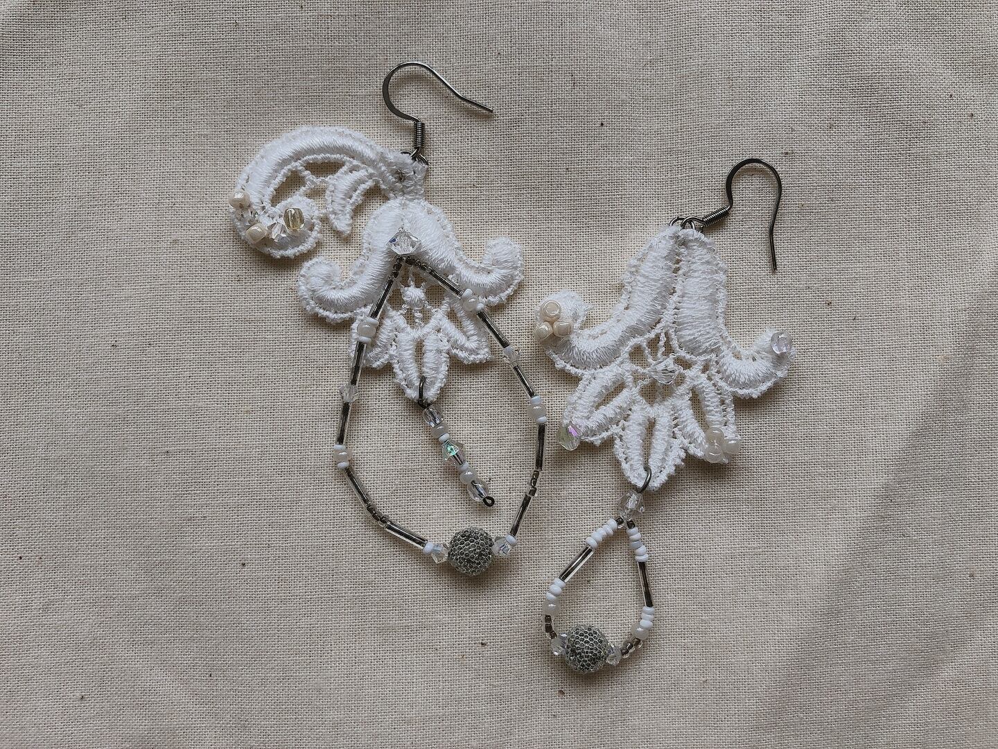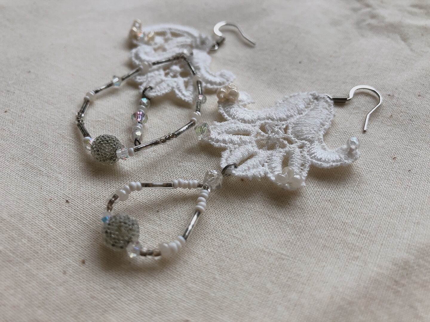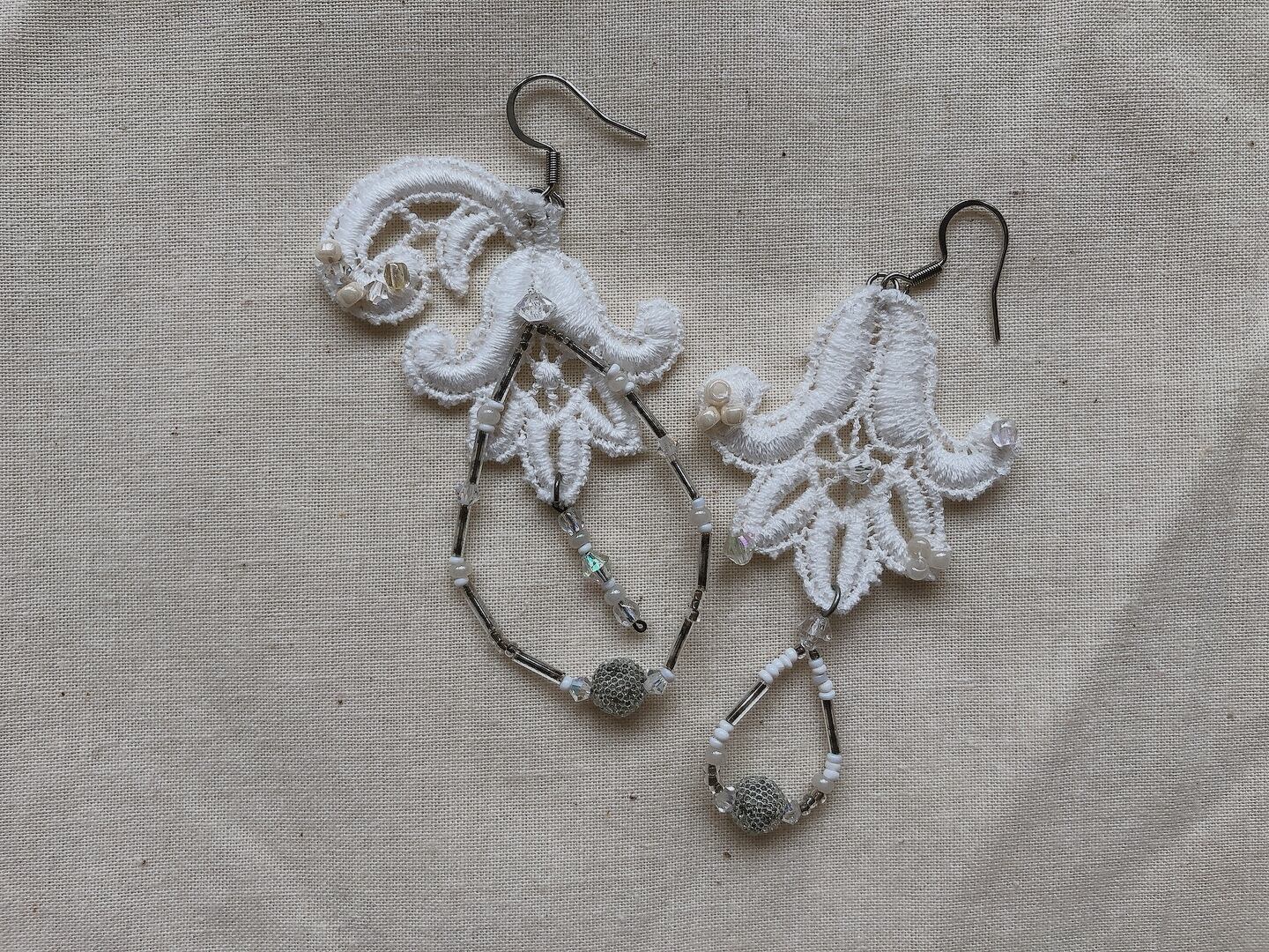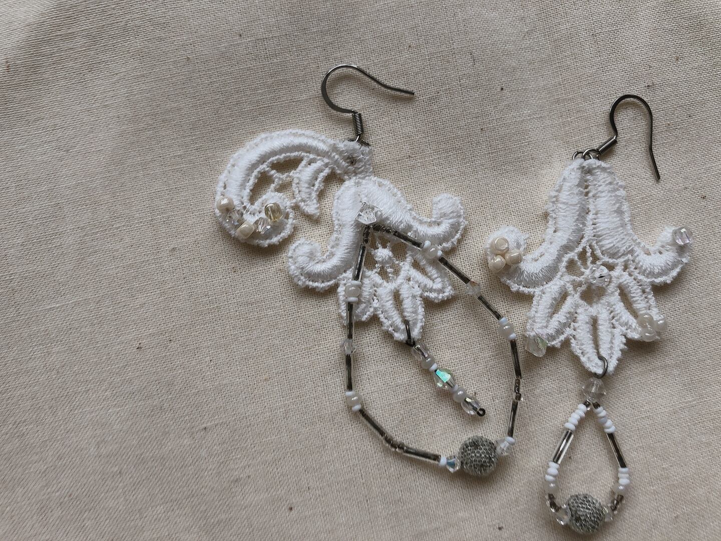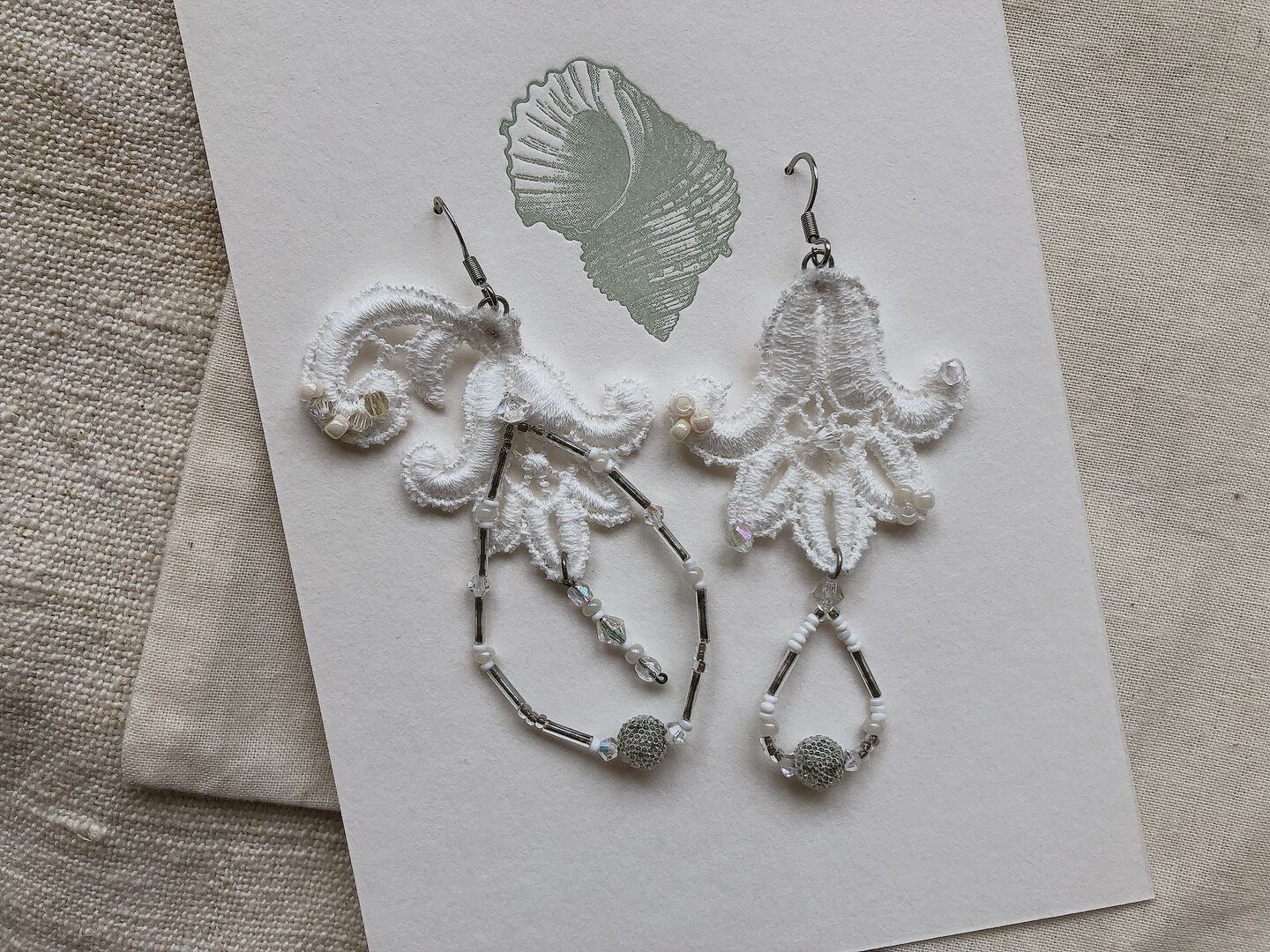 たくさん集められたそのレースたちを眺めていたときに、レースの形やさりげない立体感、連なりがあまりにもうつくしくて、こんな耳飾りがあったらなんてすてきだろうと、耳にあててみました。