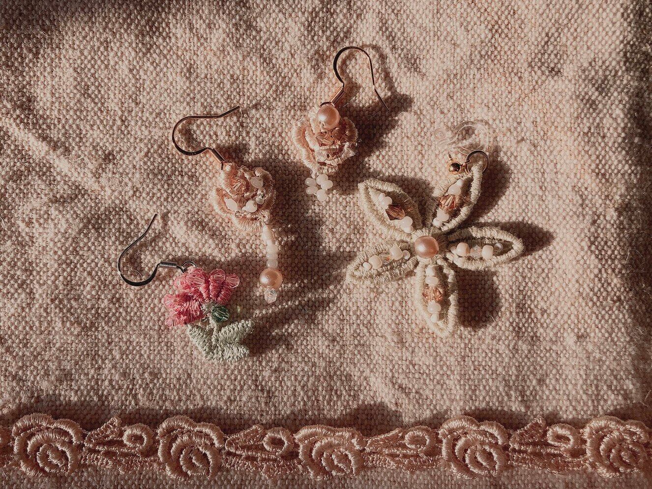 たくさん集められたそのレースたちを眺めていたときに、レースの形やさりげない立体感、連なりがあまりにもうつくしくて、こんな耳飾りがあったらなんてすてきだろうと、耳にあててみました。