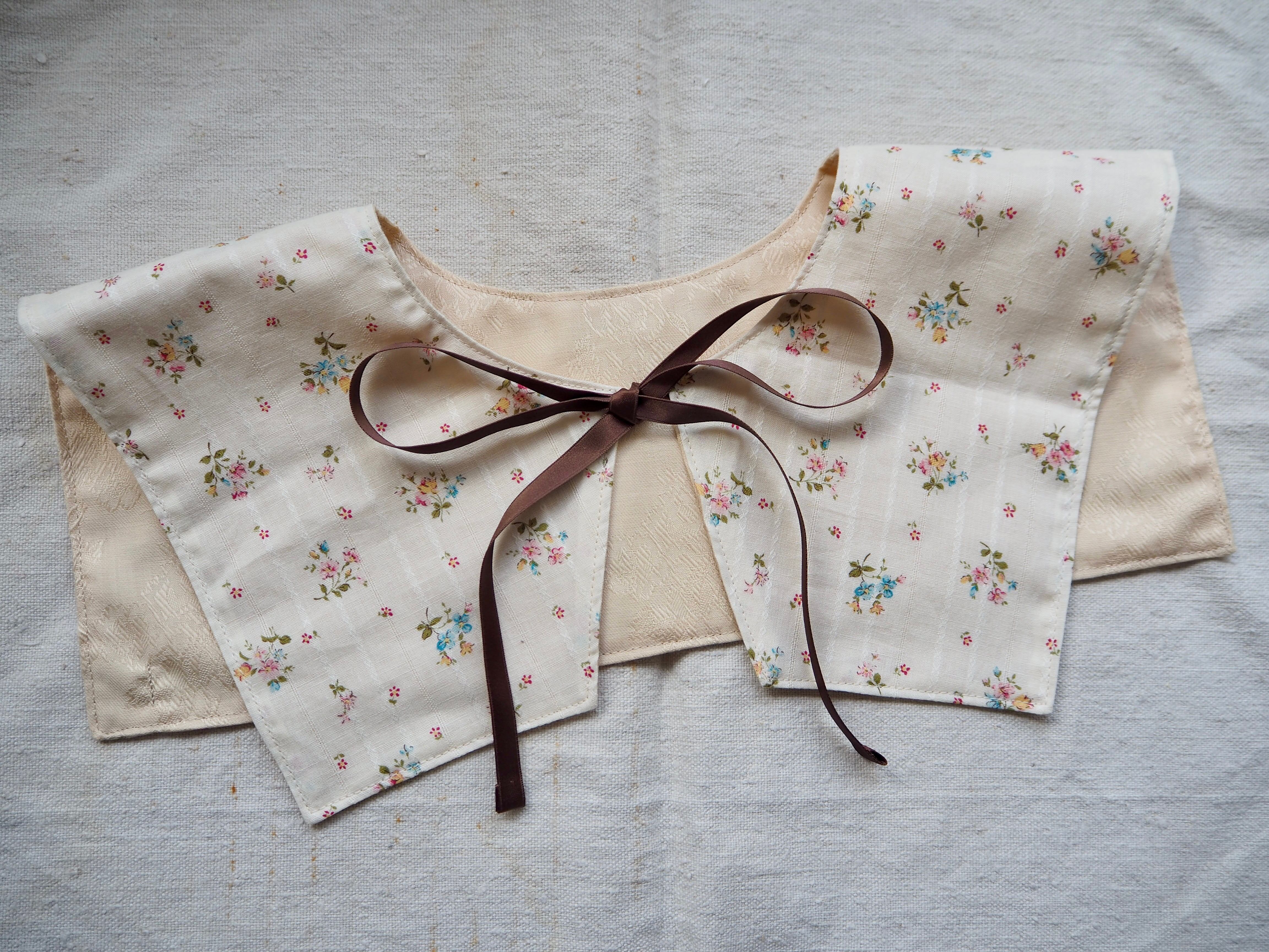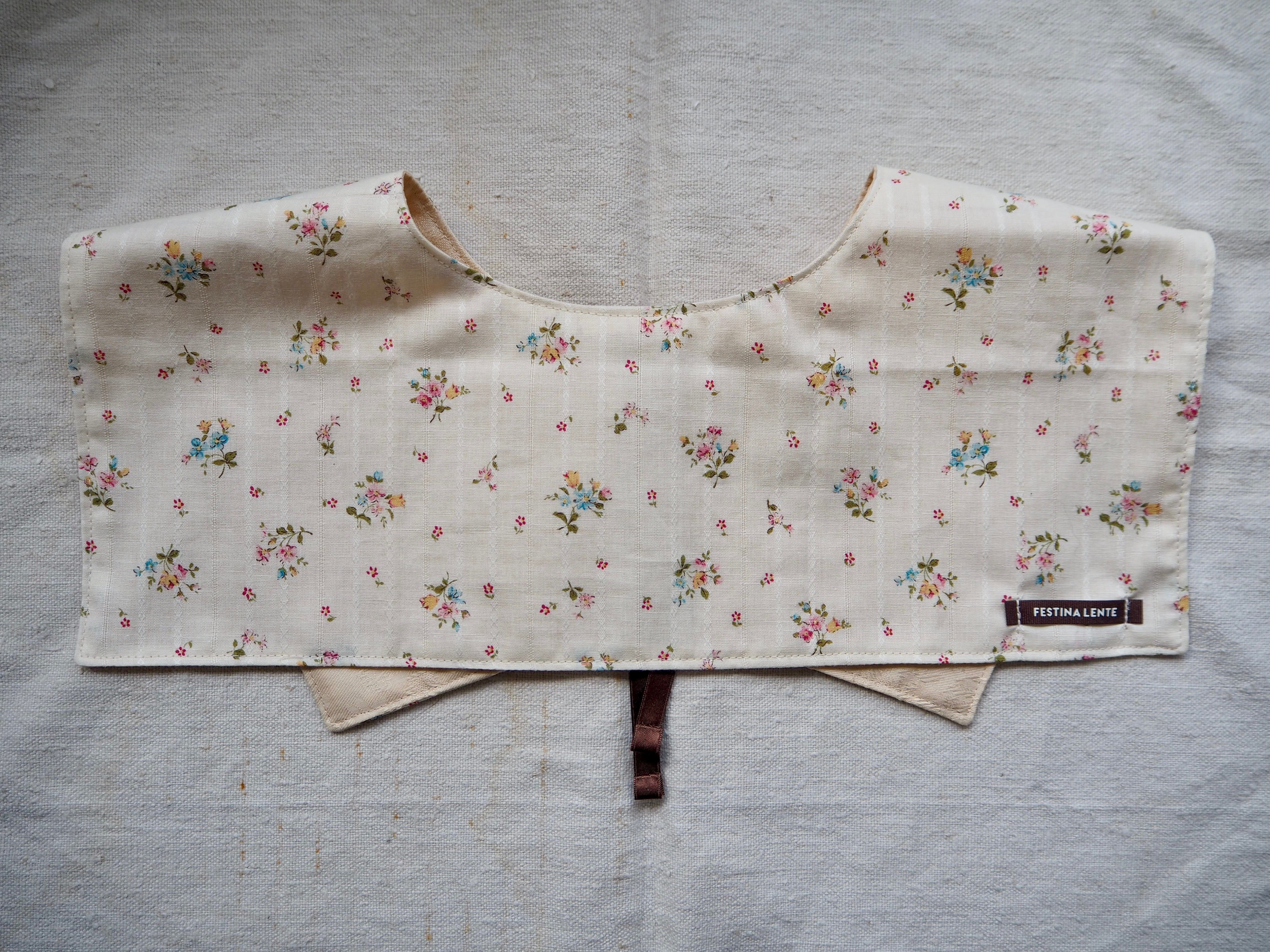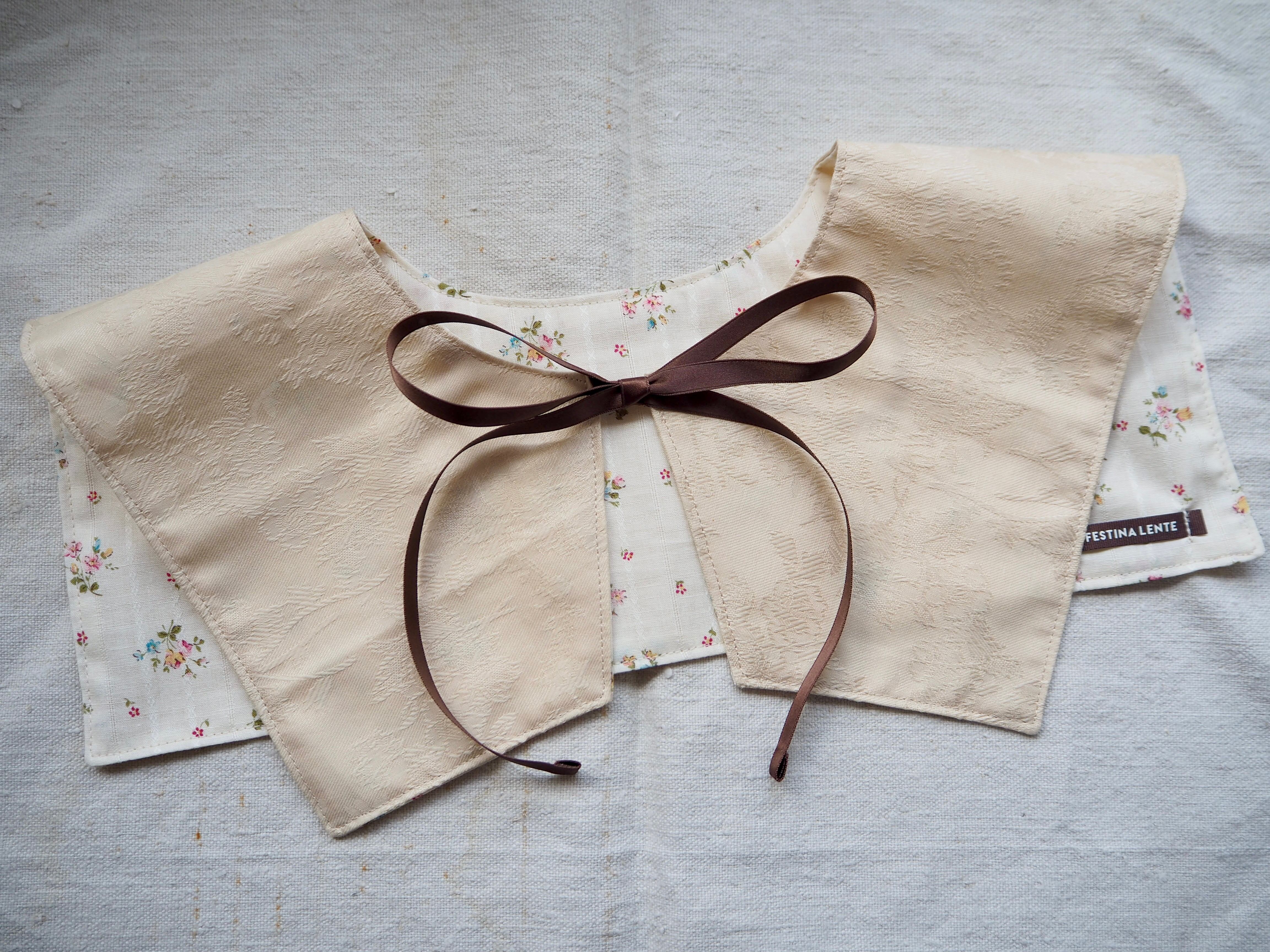 ベビー&キッズのつけ襟おめかしビブを制作していて、こんなにすてきな生地だったらおとなのつけ襟を作っても素敵だろうなと思ったことをきっかけに制作。